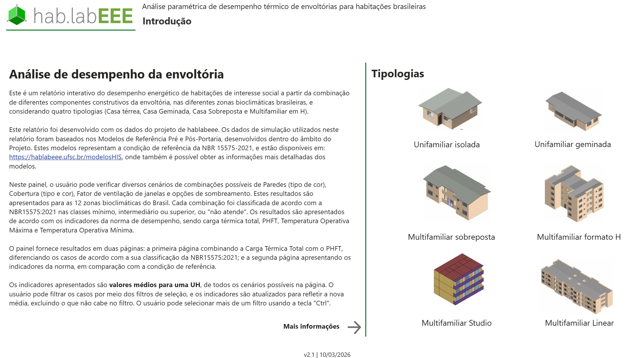 PowerBI report based on a large dataset showing combinations of building solutions (walls, roofs, colors, windows) for different cities in Brazil and their correspondent thermal performance, for Social Housing. It helps to understand which solution combination is applicable for which climate and building type.